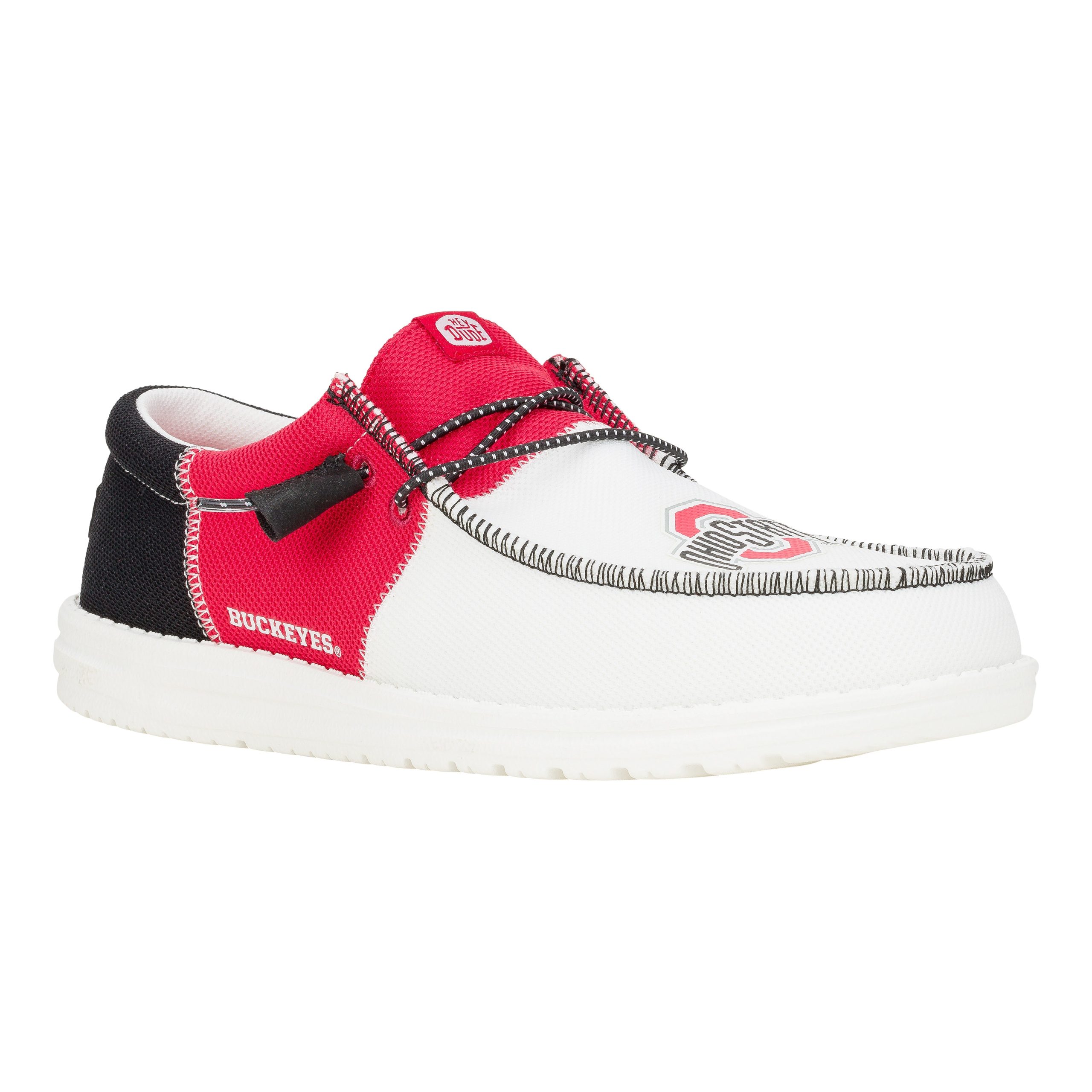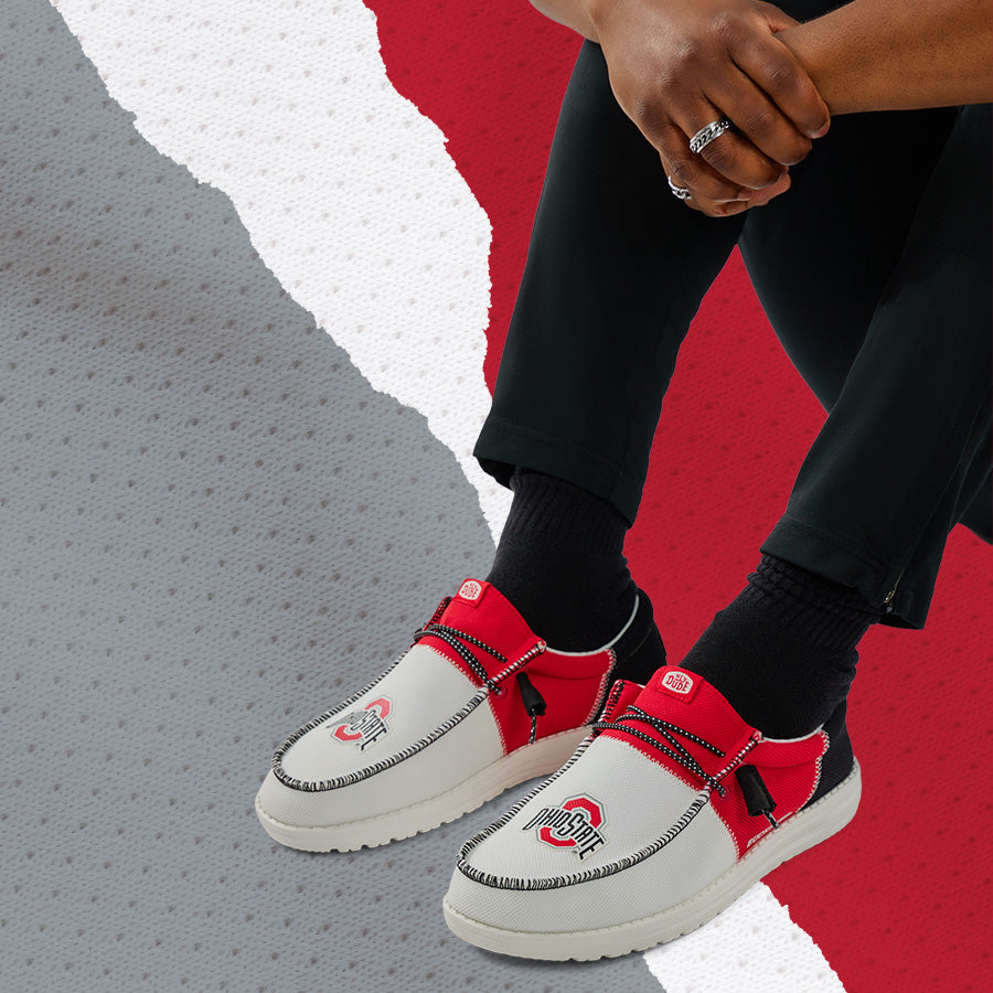 The Wally Tri now screams school spirit! Show your support for Ohio State University in style with a unique design featuring the iconic logo and bold team colors. Made with signature HEYDUDE comfort. lightweight materials. and a slip-on design. these are perfect for all-day wear to bring you and your crew from the tailgate to the game.