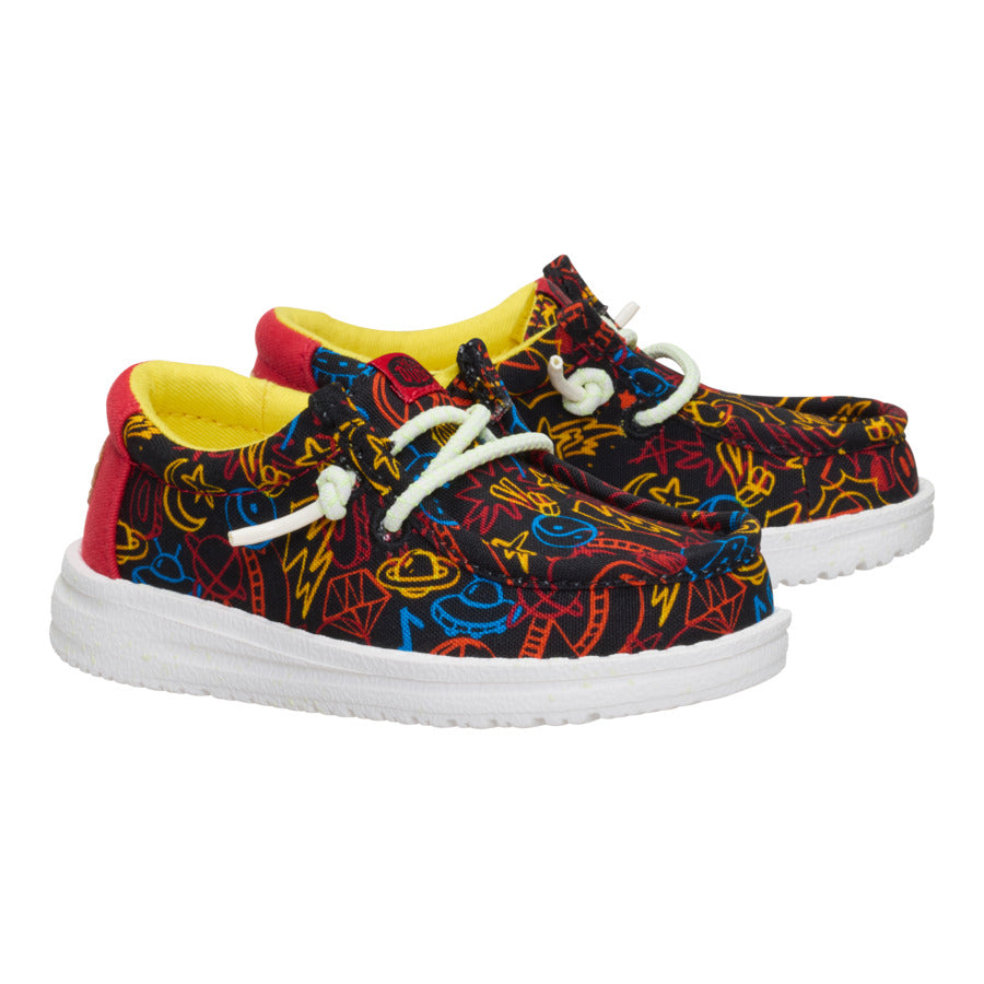 What little kid doesn’t want to glow in the dark The Wally Toddler Space Glow slip-on shoes are made from lightweight textile with an allover print that pops. Finished off with a light and flexible underfoot and a wide collar that kids can step into.